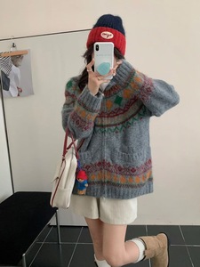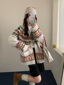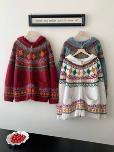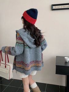 韩系复古菱形撞色连帽拉链针织毛衣女秋冬季费尔岛宽松氛围感开衫