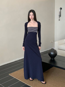 连衣裙女设计感小众一字领条纹拼接修身显瘦长款a字裙+长袖坎肩秋