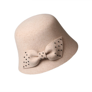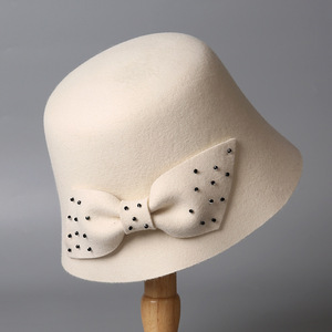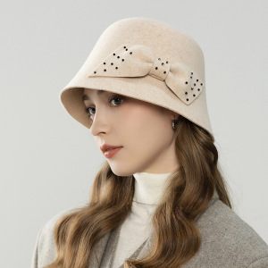 秋冬季复古缝珠侧蝴蝶结羊毛渔夫帽时尚水桶帽保暖女士帽子批发