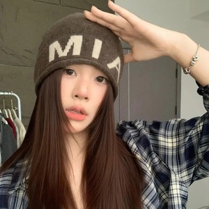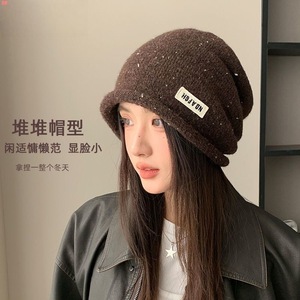 秋冬保暖显脸小堆堆帽女百搭防风针织帽大头围拼色条纹包头毛线帽