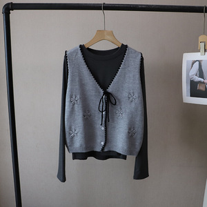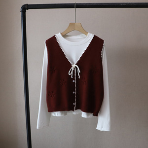 [比正]2025秋季新款韩版打底衫T恤撞色针织马甲背心两件套女5176