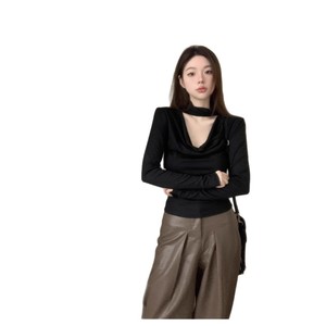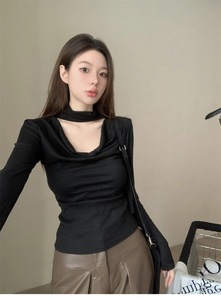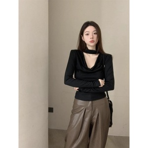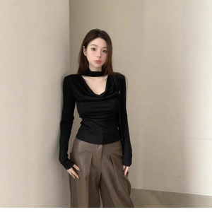 镂空挂脖荡领长袖T恤女秋冬黑色修身内搭打底衫温柔纯欲风上衣