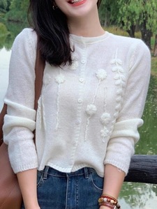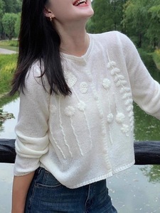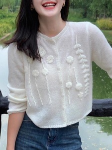初秋氛围感穿搭白色提花毛衣开衫外套女外搭早秋韩系短款针织上衣