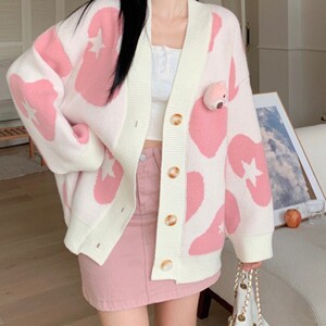 韩版软糯慵懒风设计显瘦秋冬小熊宽松拼色针织开衫撞色女毛衣外套