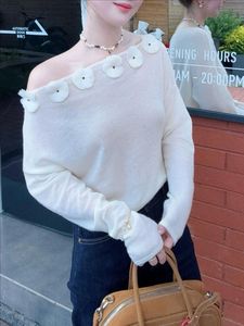 法式优雅立体花朵拼接长袖针织衫女秋季穿搭小香风一字肩露肩上衣