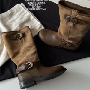 牛皮版~真皮长筒靴女2025新粗跟圆头拼接西部靴褶皱堆堆靴骑士靴