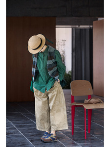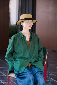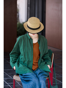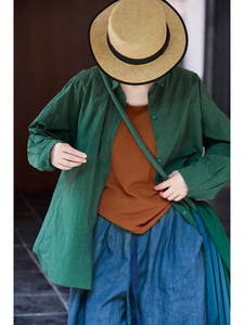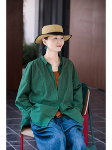 秋季新款文艺复古原创女装三季款休闲纯棉开衫森青色宽松简约衬衫