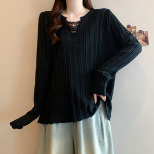 25秋冬新大码时尚设计感V领金属链条装饰长袖针织宽松打底衫上衣