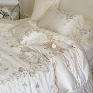 浪漫少女心100亲肤棉四件套浪漫花卉刺绣被套磨毛1.8床上用品