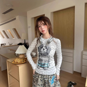 美式复古小狗波点印花修身长袖T恤女生早秋超火减龄百搭别致上衣
