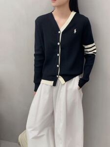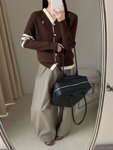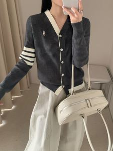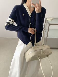 韩系设计感刺绣小标V领拼接针织开衫秋款女装秋装毛衣长袖打底衫