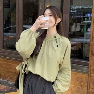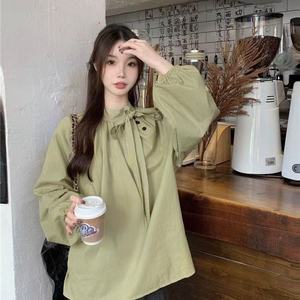 法式立领气质斜扣宽松长袖衬衫2025新款系带蝴蝶结上衣
