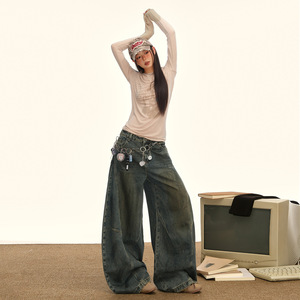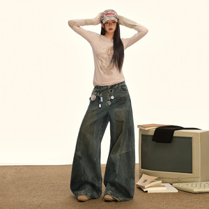 【今茵】美式复古做旧小众脏染设计松弛感男女弯刀阔腿牛仔裤子潮