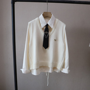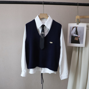 [比正]2025秋季新款韩版减龄系带针织马甲背心衬衫两件套女5173