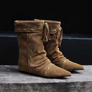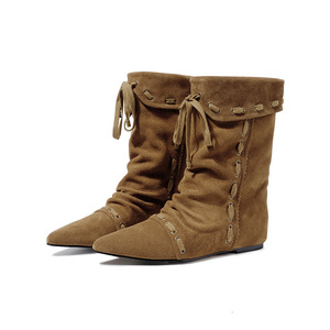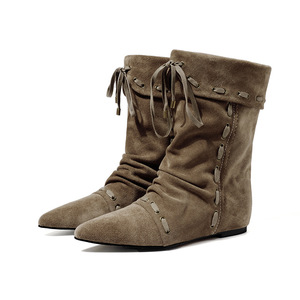 高丝光牛反绒内增高中筒靴女单靴冬新款真皮尖头套筒中筒靴女单靴