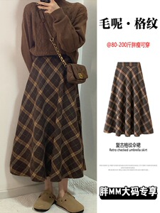 毛呢格纹伞裙半身裙女秋冬2025新款大码胖mm高腰显瘦遮胯a字长裙