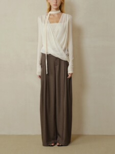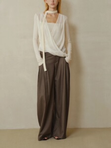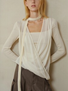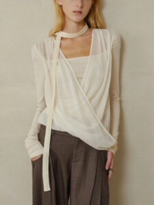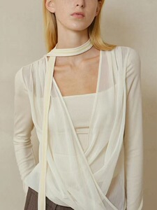 垂褶交叠网纱假两件丝绒挂脖羊毛针织上衣
