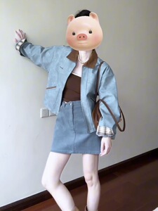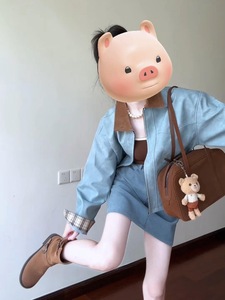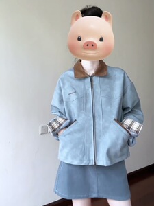 日系巴恩风撞色翻领皮衣外套女春秋季设计感小众水洗感开衫夹克潮