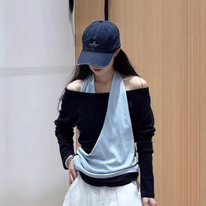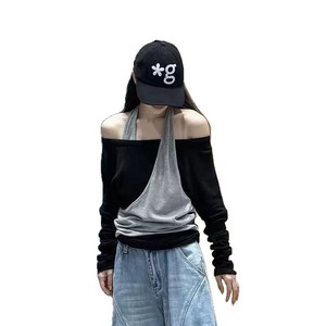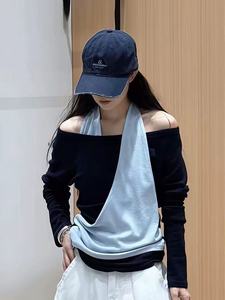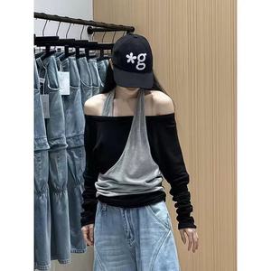时尚辣妹风撞色拼接假两件挂脖t恤女早秋季小众宽松百搭胖mm上衣