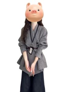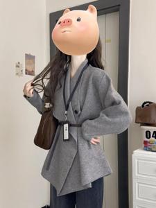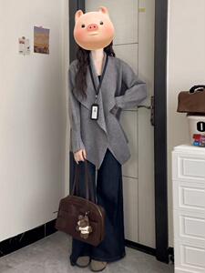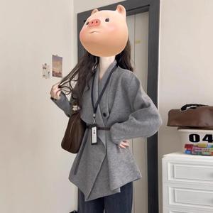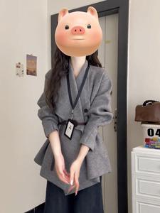 灰色翻领毛衣外套女秋冬2025新款慵懒感收腰秋季针织开衫上衣