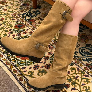 牛皮版~韩版复古西部牛仔靴女英伦风皮带扣宽筒不过膝粗跟骑士靴