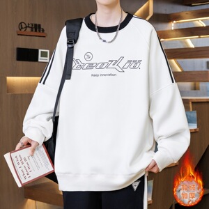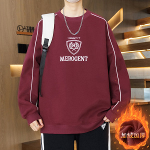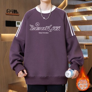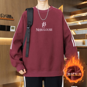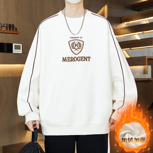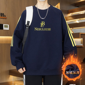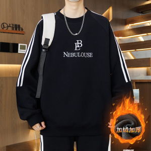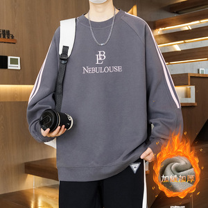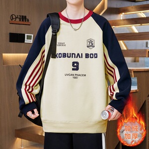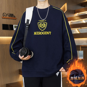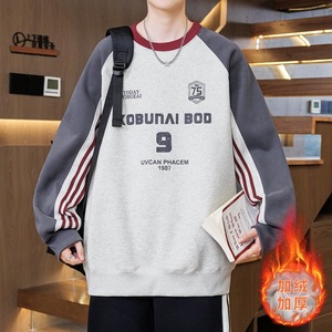 秋冬季青少年潮牌圆领加绒加厚卫衣男孩初中高中学生潮流男装上衣