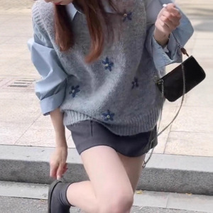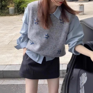 法式灰色提花针织无袖坎肩马甲女早秋季叠穿短款毛衣背心上衣外搭