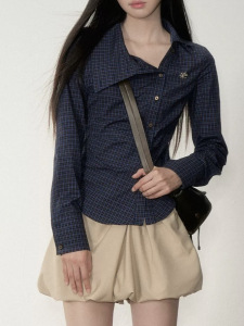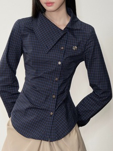 Soote Season 原创深藏青斜翻领复古格纹掐腰显瘦长袖衬衫上衣女