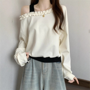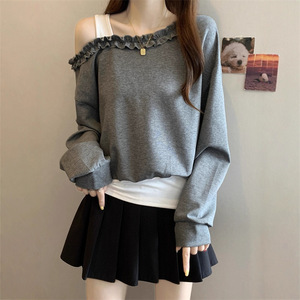 木耳边一字领露肩长袖卫衣女早秋大码胖MM气质减龄显瘦假两件上衣