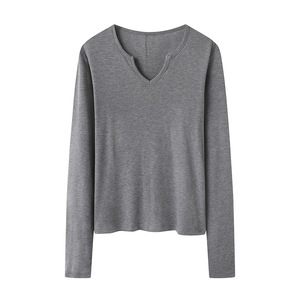 天丝桑蚕丝小V领休闲长袖T恤女洋气百搭舒适打底衫25秋季百搭上衣