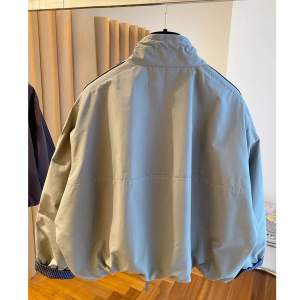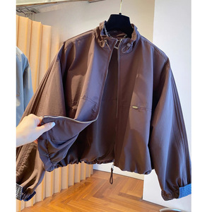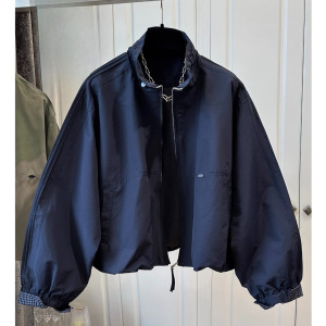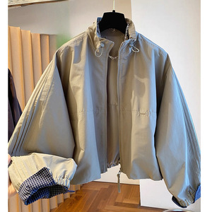 美式复古短款夹克女2025春秋新款宽松立领格子拼接薄外套