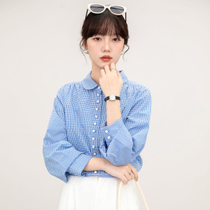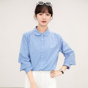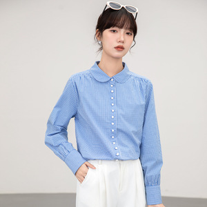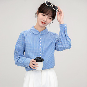 法式复古娃娃领蓝色格纹长袖衬衫女春秋2025新款宽松百搭长袖衬衣