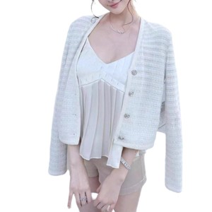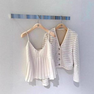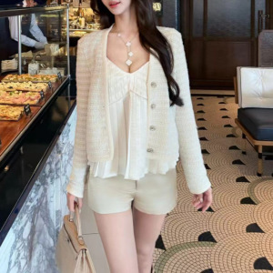 韩雨嘉京都贵女小香风编织外套 仿醋酸吊带 高腰缎面短裤套装串珠