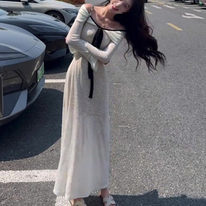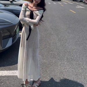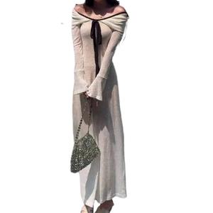 法式气质一字肩系带长袖连衣子女秋季修身显瘦露肩喇叭袖包臀长裙