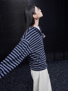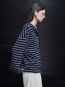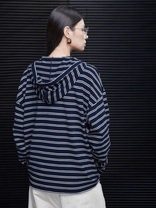 moment藏青条纹宽松连帽卫衣女2025秋季新款爆款流行慵懒风洋气