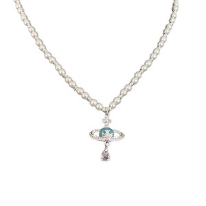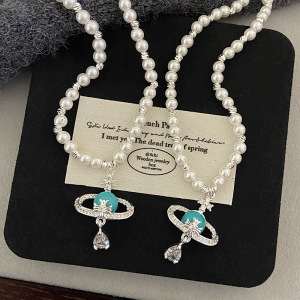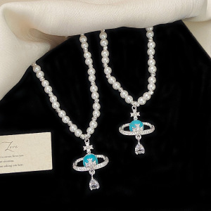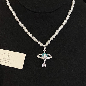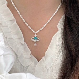 土星星球绿松色吊坠水滴施家珍珠满锆项链女气质精致百搭锁骨链