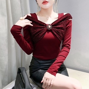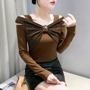 2025秋季气质方领露肩烫钻短袖T恤女洋气减龄显瘦百搭轻奢上衣