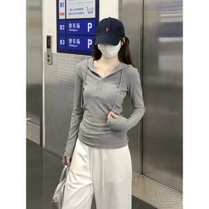 格雷系灰色连帽正肩T恤女2025秋季纽扣设计感长袖半开V领打底上衣