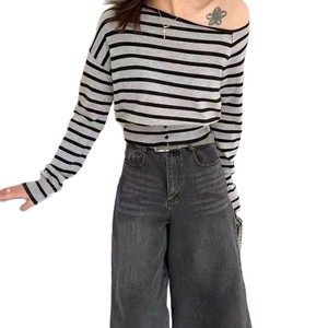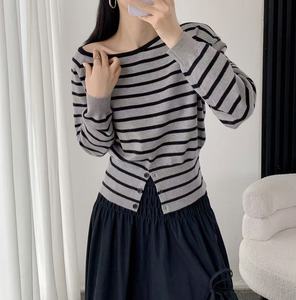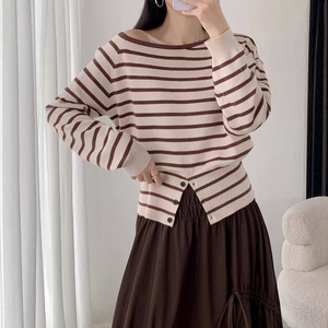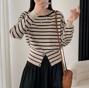 法式条纹不规则开叉针织T恤女秋季软糯毛衣下摆纽扣收腰小众上衣