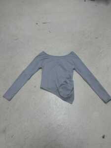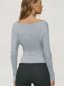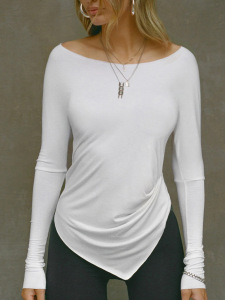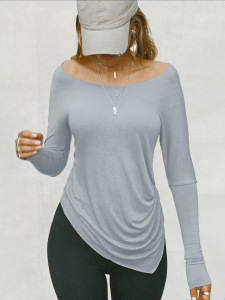 新款圆领温柔清新风大领口不规则摆长袖上衣修身显瘦纯色长袖上衣