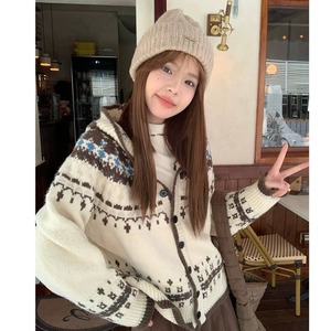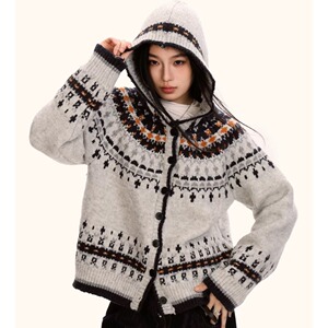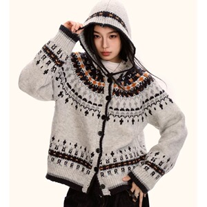 2025复古连帽毛衣男女秋冬新款撞色慵懒风连帽开衫针织休闲外套