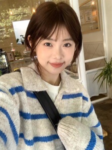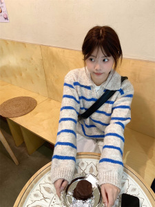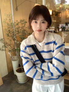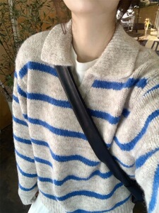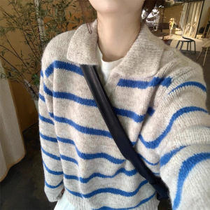 欧货小众蓝色条纹polo翻领长袖软糯针织衫毛衣女秋冬慵懒套头上衣