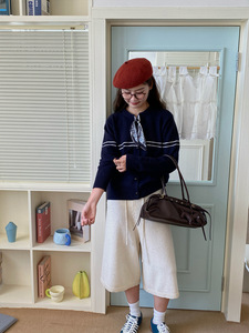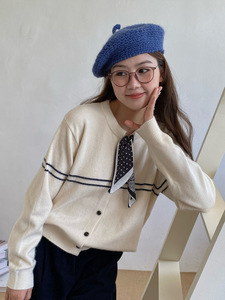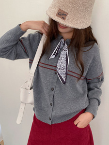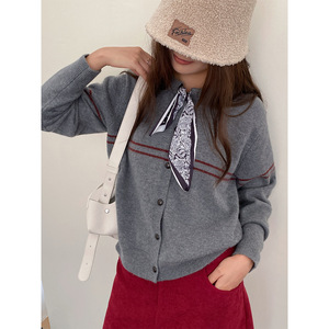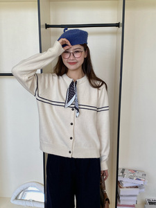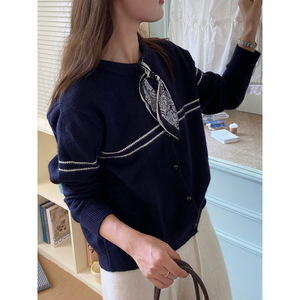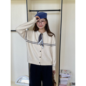 秋季新款设计感双线刺绣配丝巾针织衫显瘦温柔气质长袖上衣女ZEN