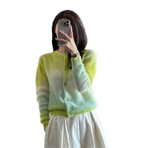 韩系chic穿搭渐变绿色针织开衫女春秋新款小众外搭设计感毛衣外套