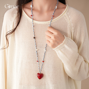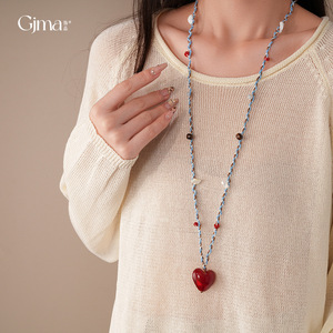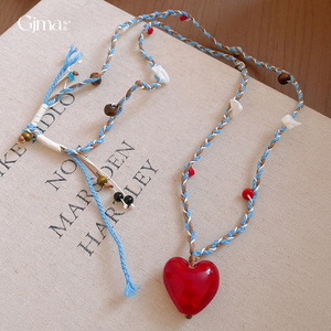 复古多巴胺编织绳玻璃爱心吊坠项链轻奢高级感毛衣链时尚清新项饰