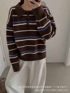 韩国新款毛衣套头针织衫polo领撞色条纹韩系时尚洋气宽松上衣女装