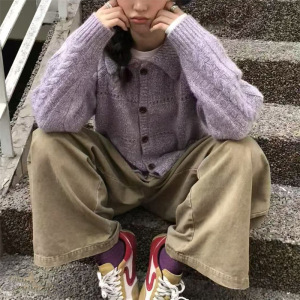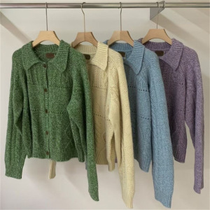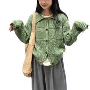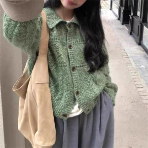 温柔风高级感复古绿色毛衣女开衫春秋外穿软糯宽松慵懒风针织外套