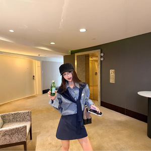 韩系百搭慵懒风宽松显瘦蓝色衬衫披肩女秋季新款搭配半身裙套装女
