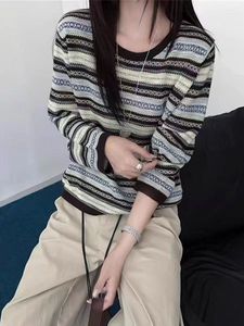 设计感复古条纹针织衫女2025新款韩系穿搭上衣秋季薄款毛衣打底衫