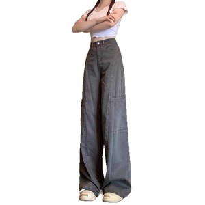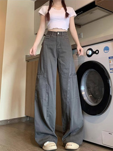 灰色阔腿工装裤女春秋新款宽松百搭休闲梨型身材显瘦直筒牛仔裤子